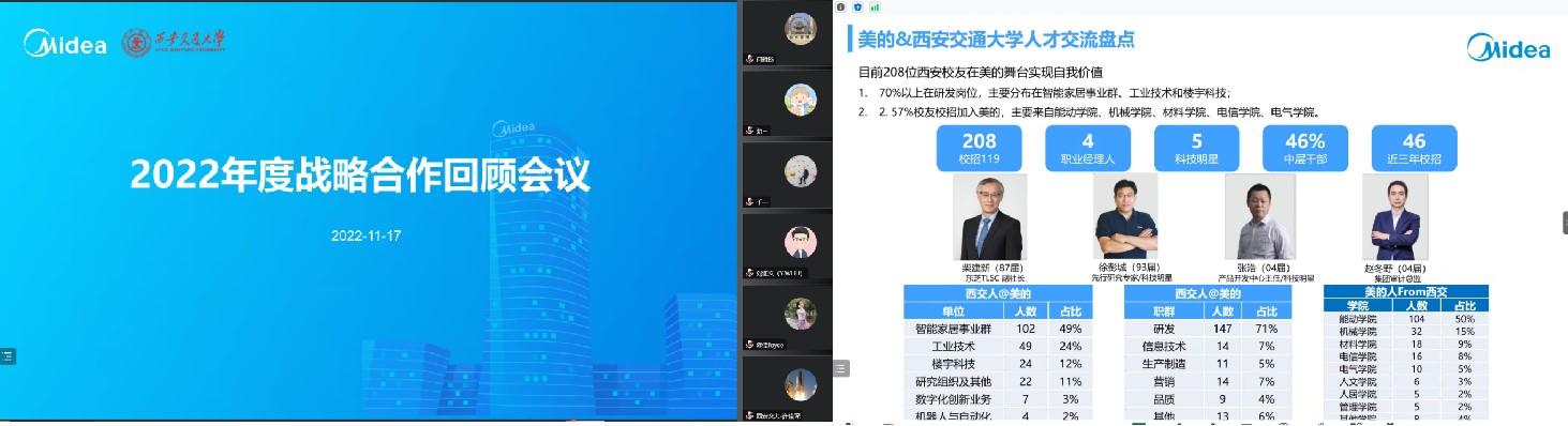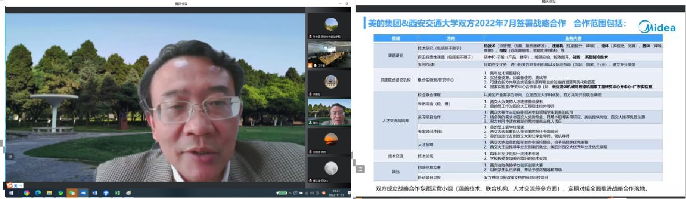 11月17日,美的集团-西安交通大学战略合作交流会议在线上召开。美的中央研究院、人力资源部、楼宇科技事业部、制冷设备有限公司等多个部门参与会议;西安交通大学副校长席光教授、中国科学院院士何雅玲教授出席会议并致辞,学校科学与技术研究院、学生就业创业指导服务中心、能源与动力工程学院相关负责人参加会议,能动学院热流科学与工程系、制冷与低温工程系、流体机械及工程系等教师代表做技术交流分享。
