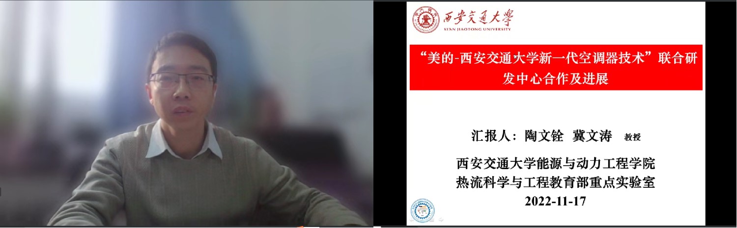 能动学院热流科学与工程系冀文涛教授代表陶文铨院士介绍了 “美的-西安交通大学新一代空调器技术”联合研发中心合作历程及进展,围绕家用空调、商用多联机等领域,布局家电合信技术和未来技术新方向。