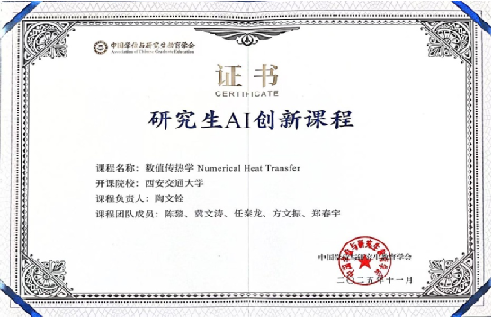在课程负责人陶文铨教授的带领下,教学团队陈黎,冀文涛,任秦龙,方文振等年轻老师传承弘扬“听党指挥跟党走”的西迁精神,注重结合课程内容对学生政治认同、家国情怀、文化素养和道德修养的熏陶,努力激发学生热爱祖国、勇于创新、科技报国的使命担当,得到广大研究生的高度认同。课程先后入选“国家级课程思政示范课程”“西安交通大学研究生精品课程”“西安交通大学AI课程建设类教改项目”,荣获“西安交通大学研究生教学成果奖特等奖”。