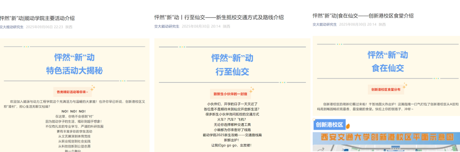 能动学院的迎新服务链条,从线上延伸至线下,从毕业季延续到开学季。暑假期间,学院便启动了线上“怦然新动”系列推送,通过《初识仙交》《食在仙交》等十余篇专题内容,将校园的衣食住行、学习生活全景式地呈现给新生,帮助他们消除陌生感,提前融入新环境。迎新现场,学生骨干及“攀登班”同学组成的志愿者队伍,在两校区多个迎新点联动,高效地为新生提供校园介绍、手册发放、行李搬运等一站式服务,确保了每一位新生都能快速、顺利地完成报到与入住。能动学院2025级新生范海洋说到:“从本科到研究生,我始终被交大人‘与党和国家、与民族和人民同呼吸、共命运’的赤子情怀所打动。能动学院既有大师引路,又有温情育人,让我对未来的科研之路充满向往。我愿如向阳之苗在此扎根,以实际行动践行西迁精神,成长为不负期望的新时代西迁精神传人。”
